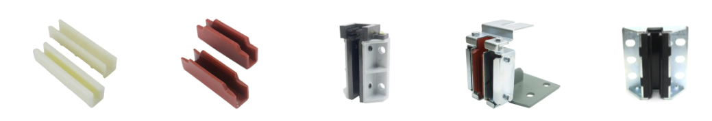 Hissguideskor är viktiga komponenter installerade på hisskorgen och motvikten. Deras huvudsakliga funktion är att styra hisskorgen så att den löper smidigt längs styrskenorna och begränsar vagnens sidoförskjutning. Vanliga typer av styrskor inkluderar glidande styrskor och rullstyrskor, som spelar en nyckelroll för stötdämpning, ljudreducering och stabil drift.